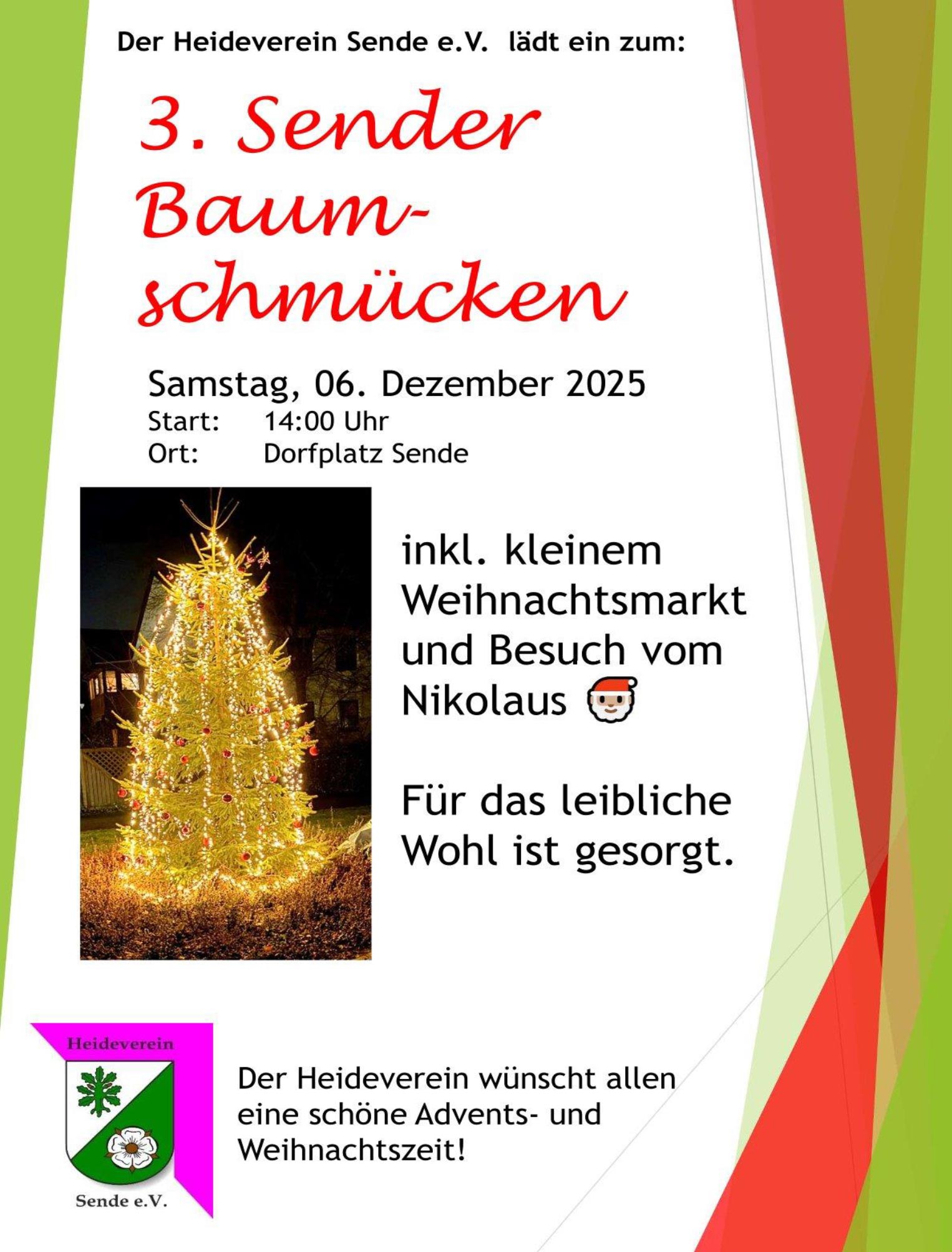 Der Heideverein Sende e.V. lädt ein zum 3. Sender Baumschmücken am 6.12.25. Start ist um